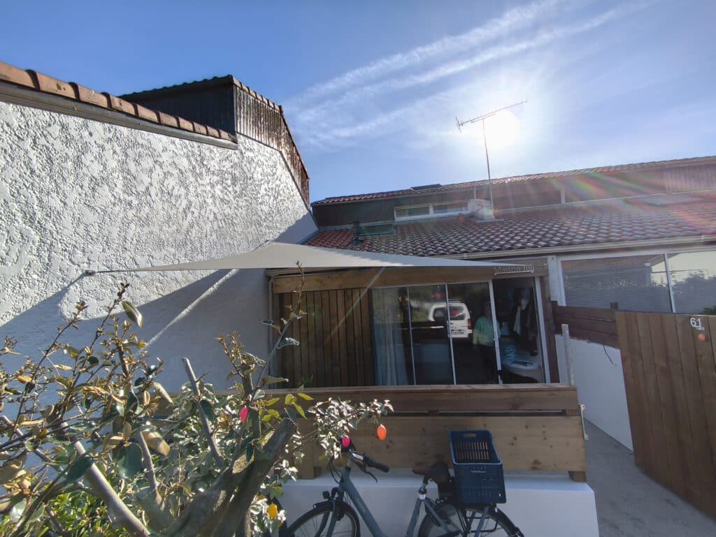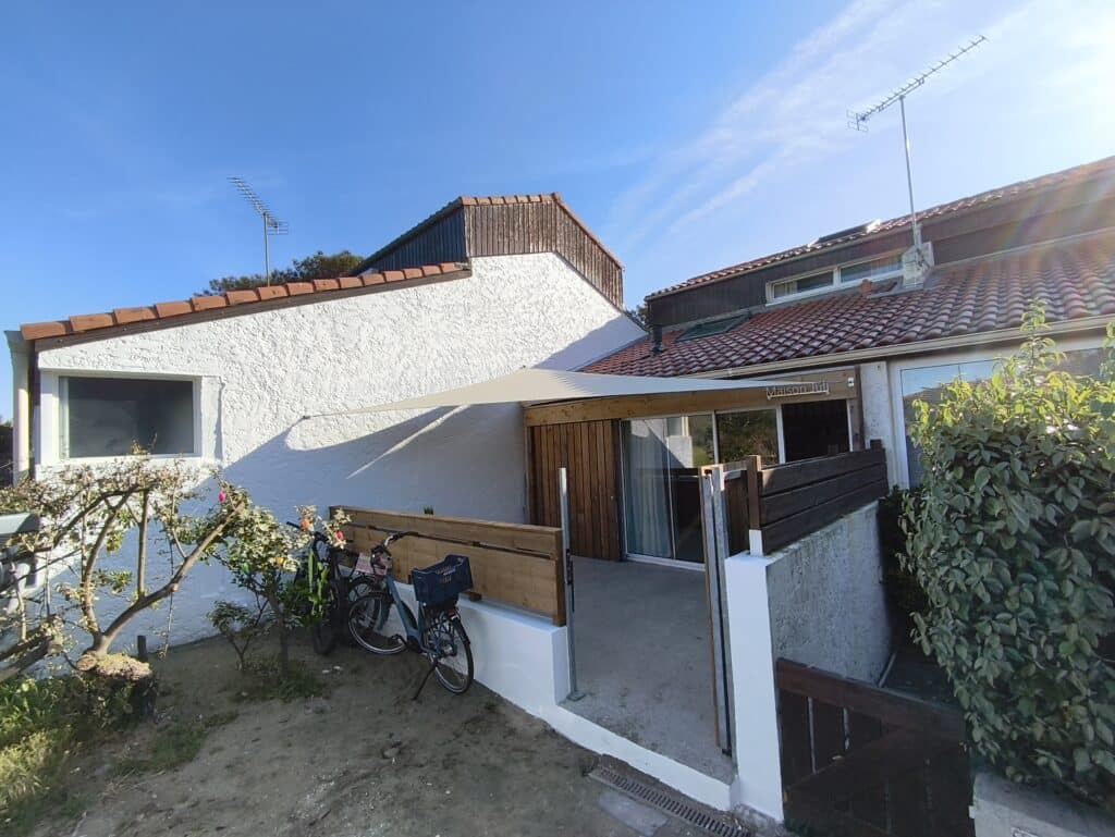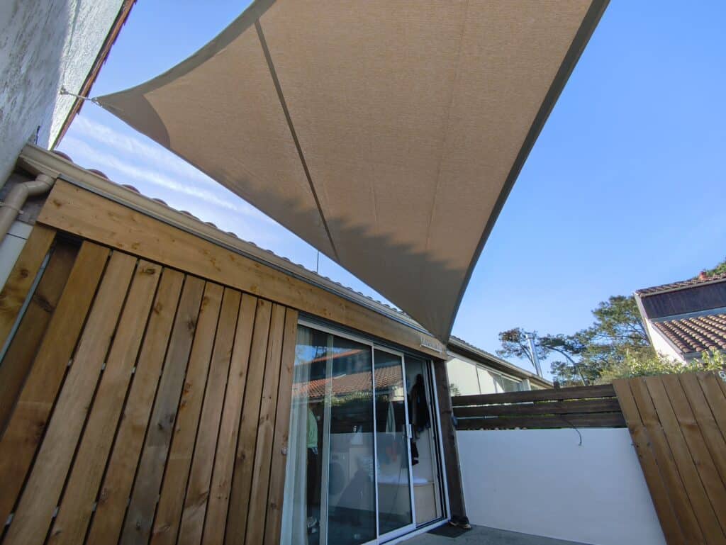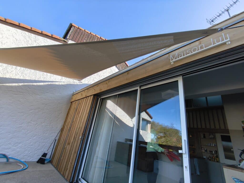Dans le cadre de la rénovation de cette jolie petite maison de plage, et pour mieux profiter de son espace extérieur, ce particulier a souhaité installer 1 voile d’ombrage sur mesure à la demande de son cabinet d’architecture : ligne architecture !